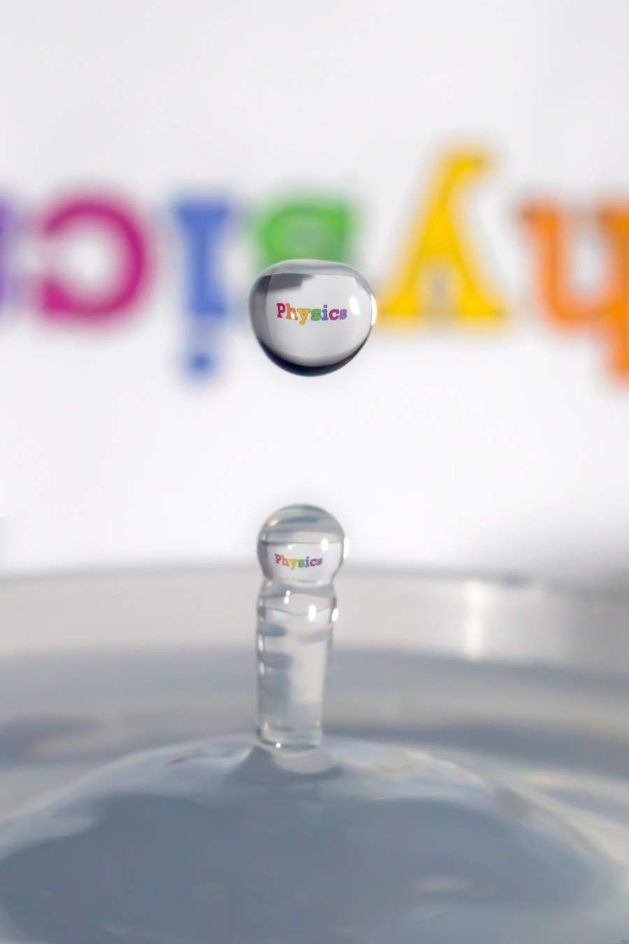 This was somewhat interesting, but now I was thinking of optics; I had seen droplets with a sort of “i” shape, with a column of water and a spherical droplet at the top. I knew spheres acted as converging lenses, and could display an inverted image of a real object. So I tested it by writing the word “physics” upside-down on a piece of paper and trying it out.